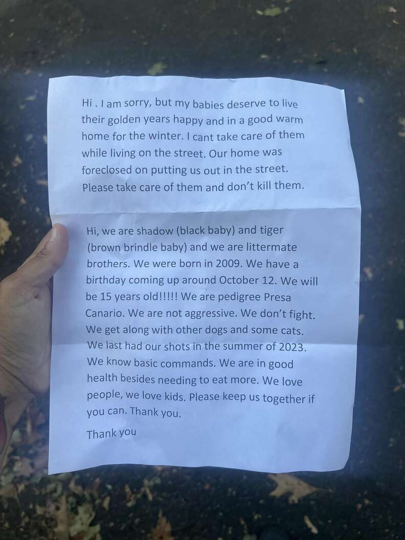 “Hi. I am sorry, but my babies deserve to live their golden years happy and in a good, warm home for the winter,” the note read. “I can’t take care of them while living on the street. Our home was foreclosed on, putting us out in the street. Please take care of them and don’t kill them.”