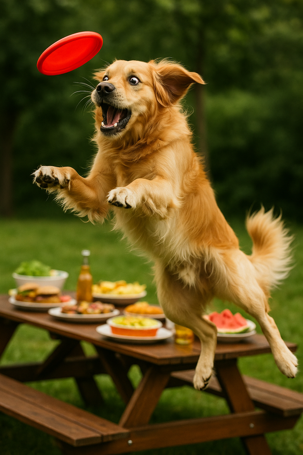 Charlie, unfazed, stood up, shook off the potato salad clinging to his fur, and wagged his tail like nothing had happened.